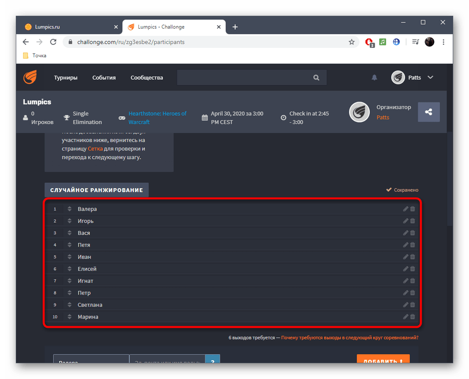 Список участников был создан. До момента начала турнира его можно редактировать и применять случайное ранжирование.