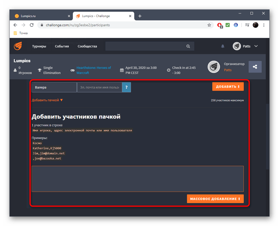 Добавьте список либо каждого игрока отдельно, присвоив электронную почту или логин в системе. При добавлении пачкой учитывайте и правила оформления, а затем подтвердите действие, щелкнув по «Массовое добавление».