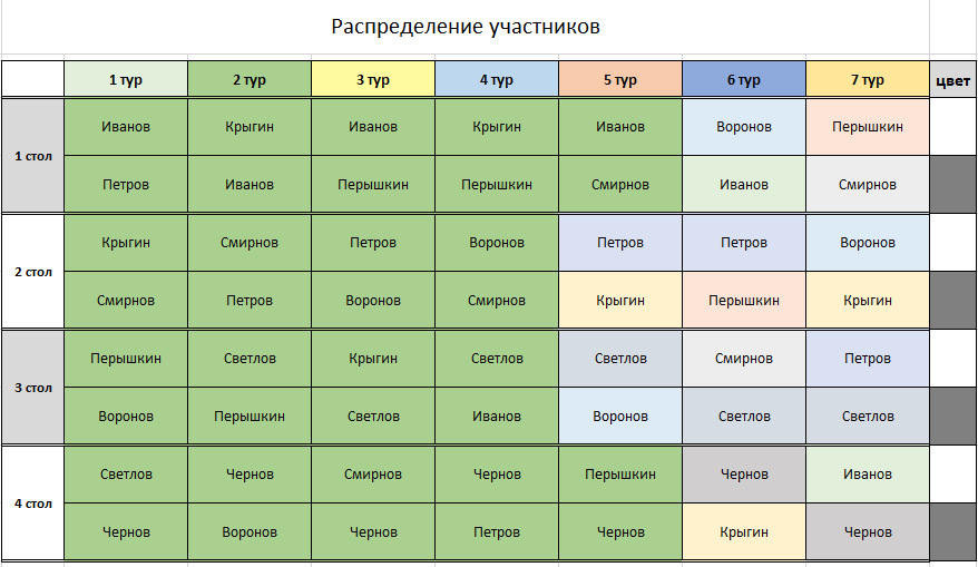 Ячейки с названием туров имеют цветовую маркировку. В основной таблице ячейки также залиты соответствующим цветом.