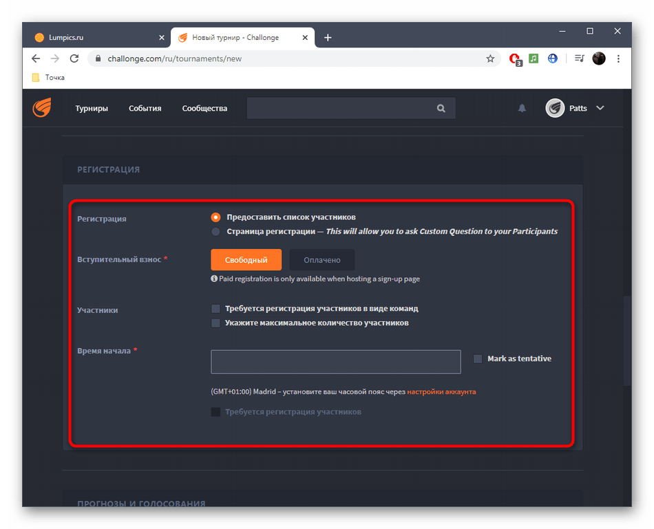Ниже на странице настраивается регистрация участников. Вы можете самостоятельно предоставить список игроков или позволить им задействовать форму регистрации, чтобы они лично включали себя в таблицу. В обязательном порядке укажите и дату начала турнира с отведенным временем для подтверждения участия.