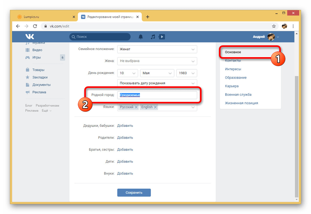 Для родного населенного пункта в разделе «Основное». Здесь каких-то строгих правил не предусматривается, поэтому можно прописывать любое название, в том числе и вымышленное. Именно в отношении этой графы чаще всего звучит вопрос, какой прикольный можно поставить населенный пункт, чтобы он запомнился пользователям. Это может быть название планеты, женское / мужское имя, вымышленное какое-то наименование