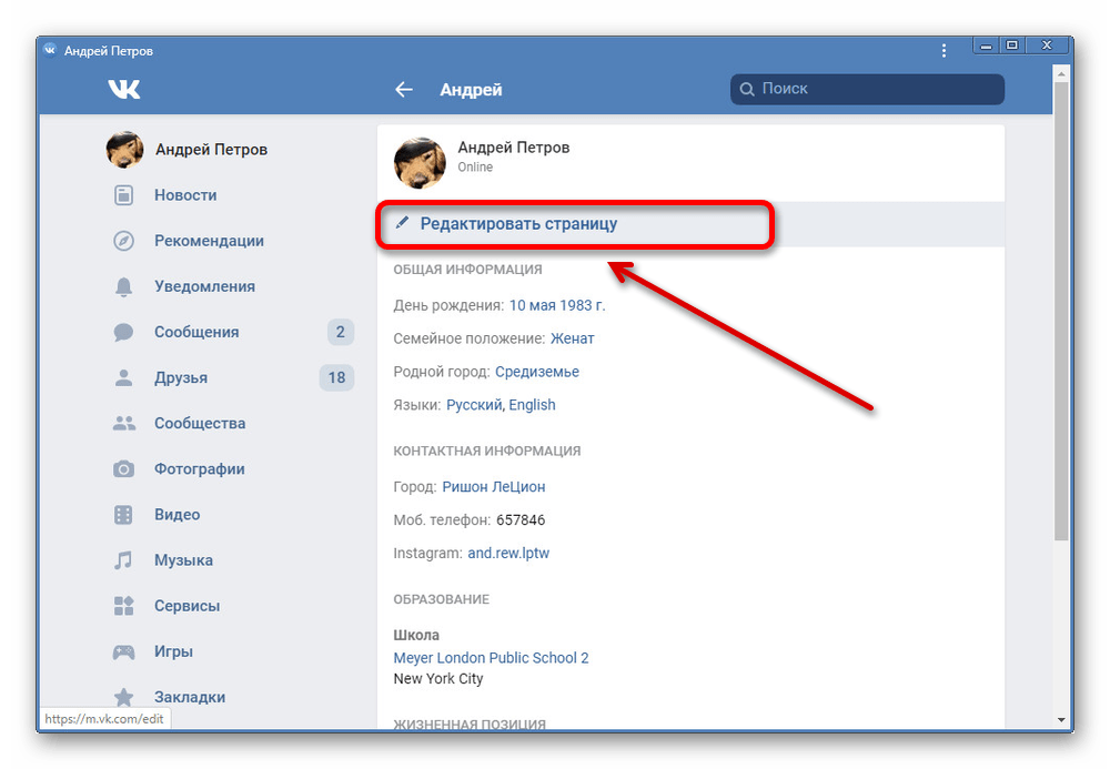 - По аналогии с первым вариантом откройте раздел «Редактировать» с главной страницы профиля, но теперь выберите пункт «Контакты».