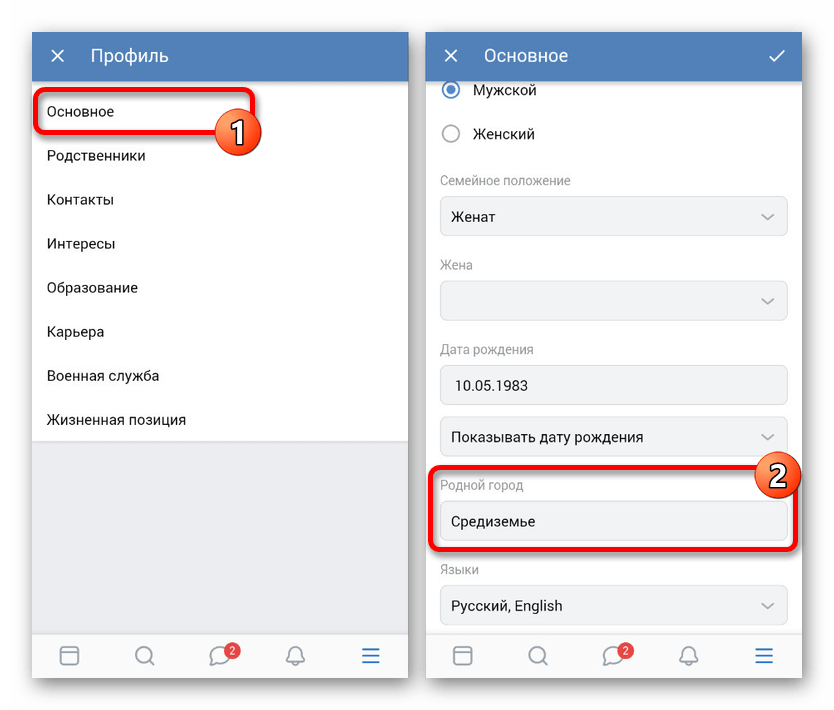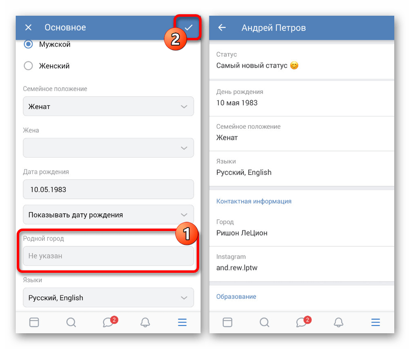 Таким способом можно поменять родной город в ВК через приложение на смартфоне.