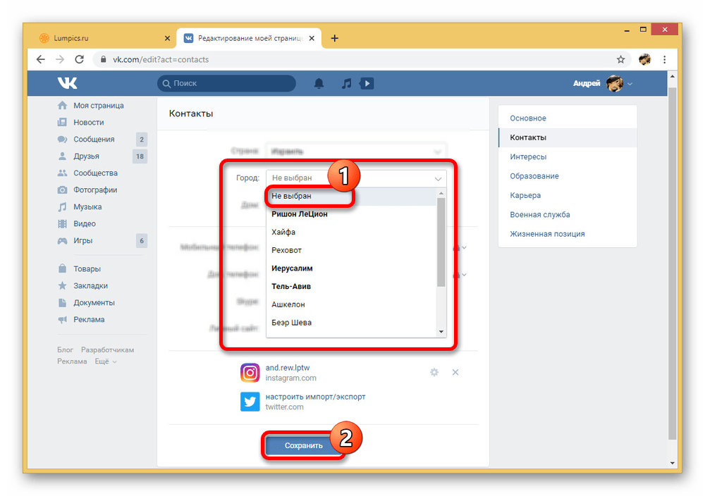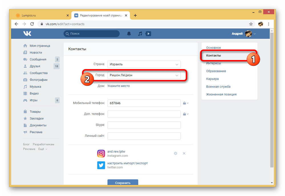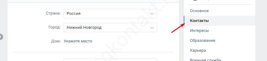 - Находясь в том же разделе с настройками профиля, переключитесь на вкладку «Контакты». Здесь необходимо найти подраздел «Город».
