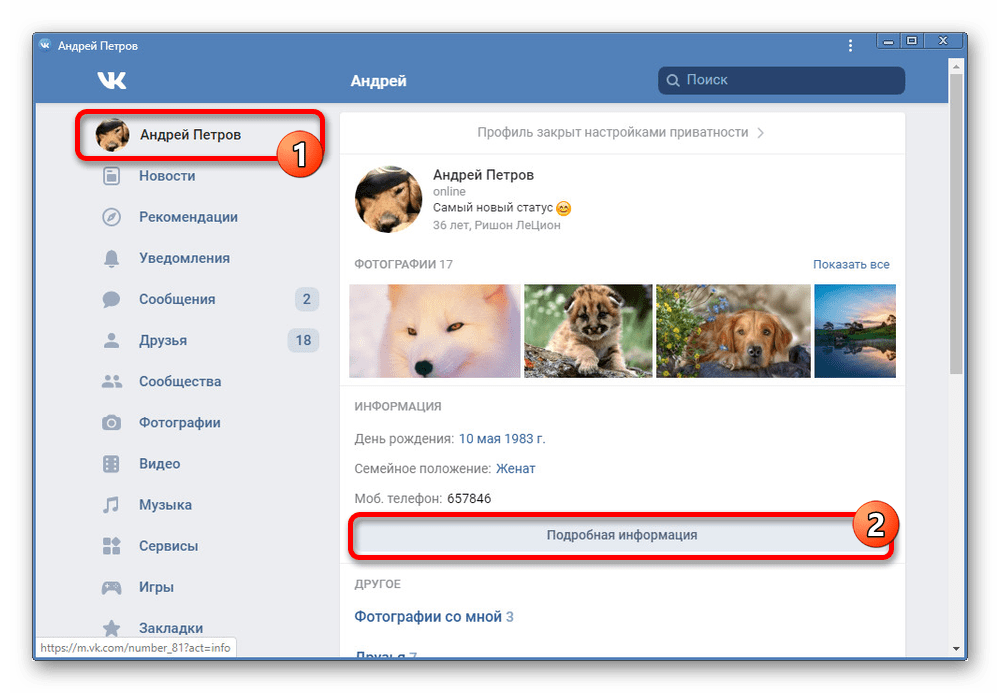 - Открыв рассматриваемую версию веб-сайта, в начале главного меню кликните по имени и фотографии профиля. Здесь необходимо в рамках блока «Информация» найти и нажать кнопку «Подробная информация».