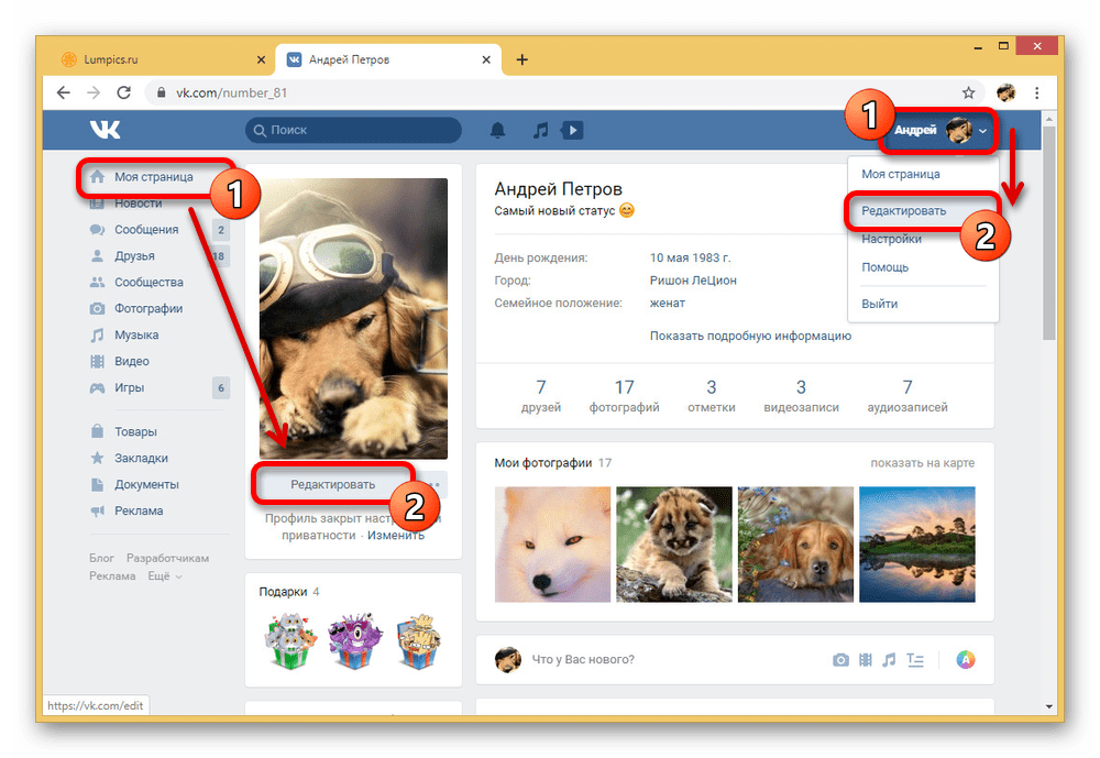 - На любой странице сайта ВКонтакте нажмите по аватарке в правом верхнем углу и выберите пункт «Редактировать». Точно так же можете воспользоваться аналогичной кнопкой под фотографией профиля в разделе «Моя страница».