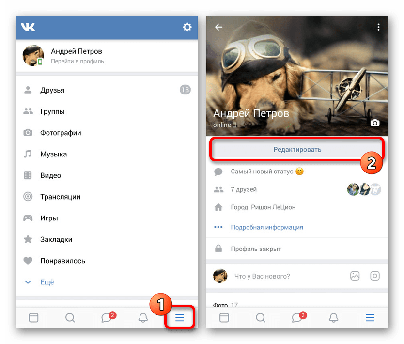 - С помощью панели в нижней части экрана зайдите на вкладку с меню и коснитесь блока «Профиль». Здесь, в свою очередь, необходимо найти и задействовать кнопку «Редактировать» под фотографией.