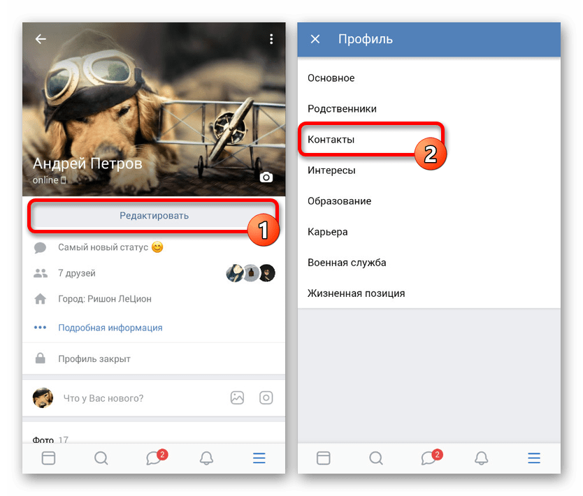- Зайдите в «Контакты», чтобы сменить город в ВК с телефона в профиле.