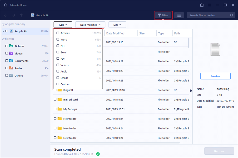Removing Recycle Bin from desktop will empty the files temporarily kept in Recycle Bin and make them inaccessible on your computer, what if there are some crucial files you need? How to restore permanently lost files from Windows 10 or Windows 11? Here comes the data recovery software to solve your problem.
