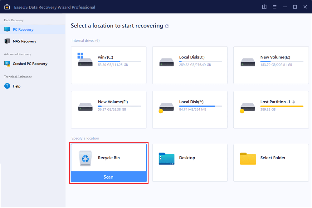 Step 1. To specifically recover files from emptied Recycle Bin on Windows 11/10/8/7, hover the mouse pointer over the «Recycle Bin» option under the «Locations» section and click «Scan».
