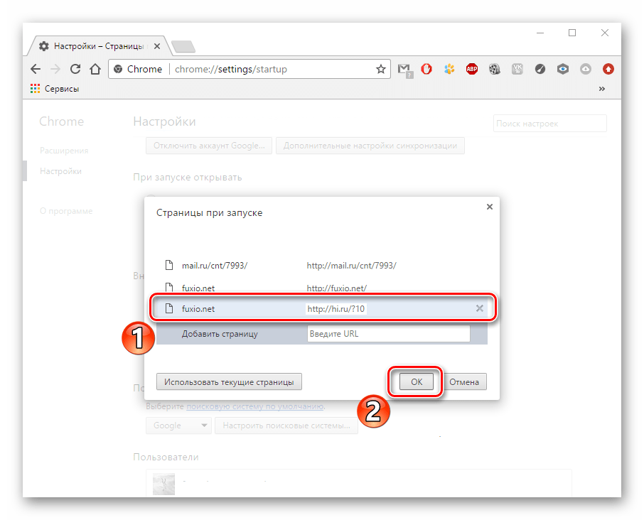 У вас должна быть открыта только страницы с Яндексом. Нажимаем на кнопку «Использовать текущие страницы» и Ок. Если будет открыто несколько страниц — они все попадут в список начальной загрузки.
