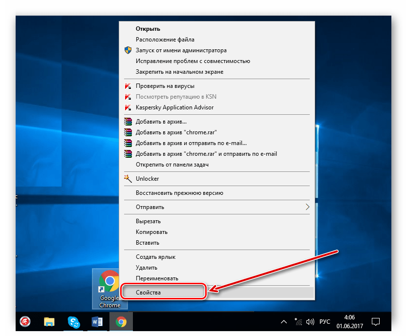 Открываем рабочий стол и находим ярлык браузера (совершенно не важно, что за браузер). Выделяем ярлык и щелкаем по нему правой кнопкой мыши. В меню, которое откроется, надо выбрать пункт «Свойства»: