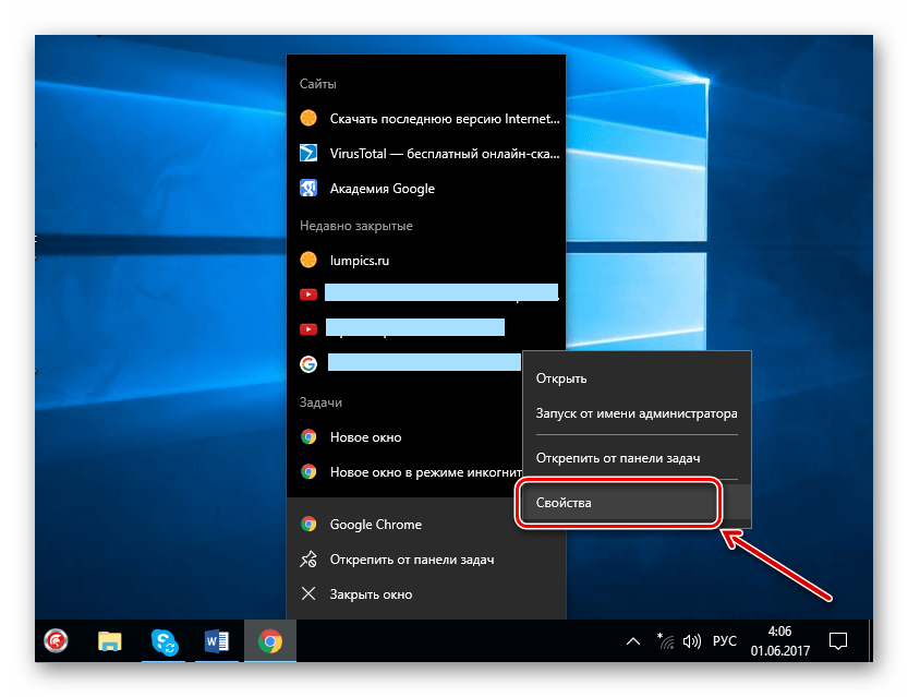- Запускаем Google Chrome и жмём правой кнопкой мышки по ярлыку, закреплённому в панели задач, а далее «Google Chrome» — «Свойства».