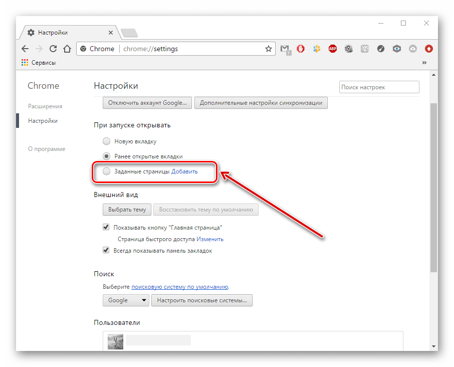 Таким образом, мы попадем на страницу со всеми настройками браузера. Теперь, нам понадобится пролистнуть страницу в самый низ. Там должен быть раздел «Запуск Chrome». А немного ниже будет представлено три варианта – новая вкладка, ранее открытые вкладки и заданные страницы. Если вы хотите поставить новую стартовую страницу, то щелкайте левой клавишей мыши по варианту «Заданные страницы».
