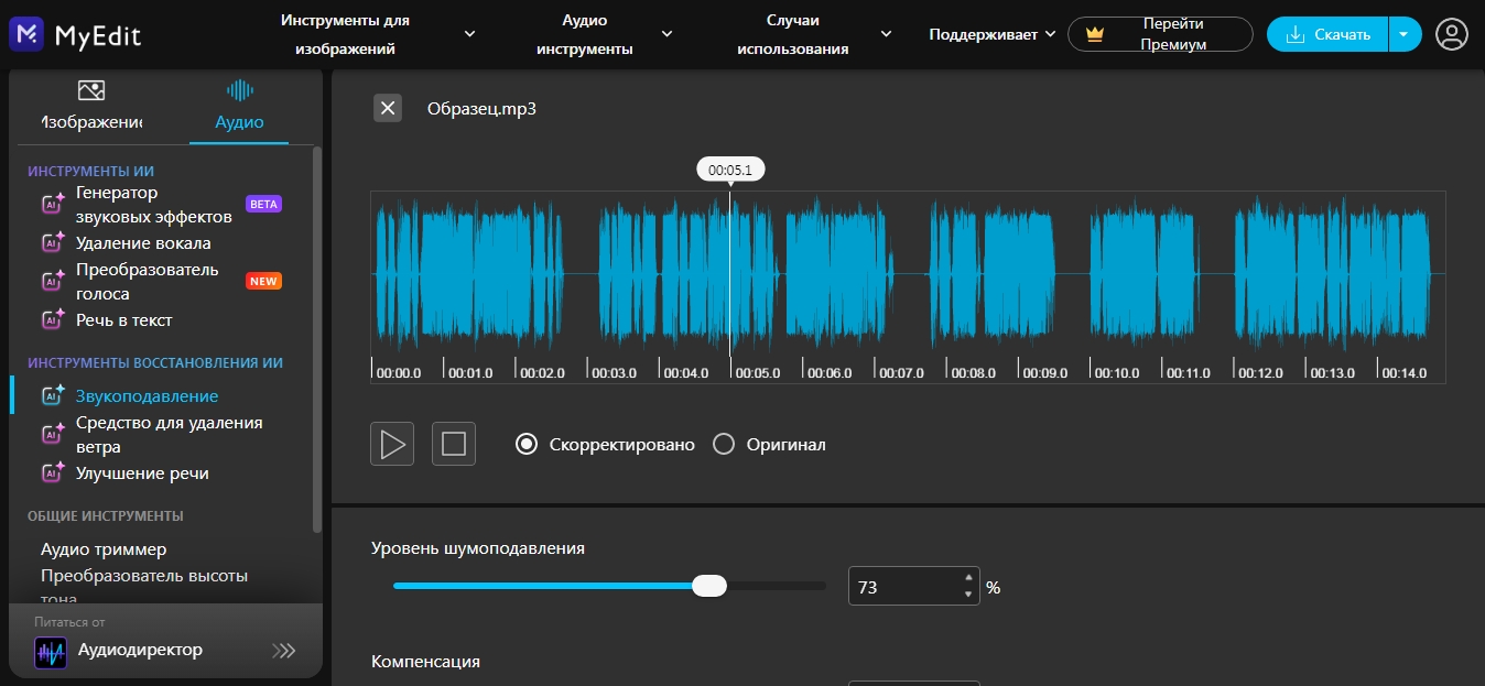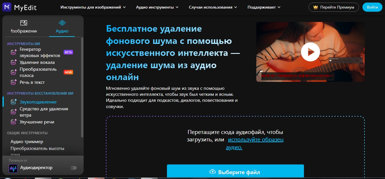 Myedit.online/en/audio-editor предлагает инструмент для удаления фонового шума из аудиофайлов. Фоновый шум может быть раздражающим и негативно сказываться на качестве звука. Сервис поможет убрать лишние звуки с аудио дорожки. С помощью этого редактора аудио вы можете почистить звук, легко и эффективно избавиться от фонового шума, сделав ваше аудио более чистым и профессиональным.