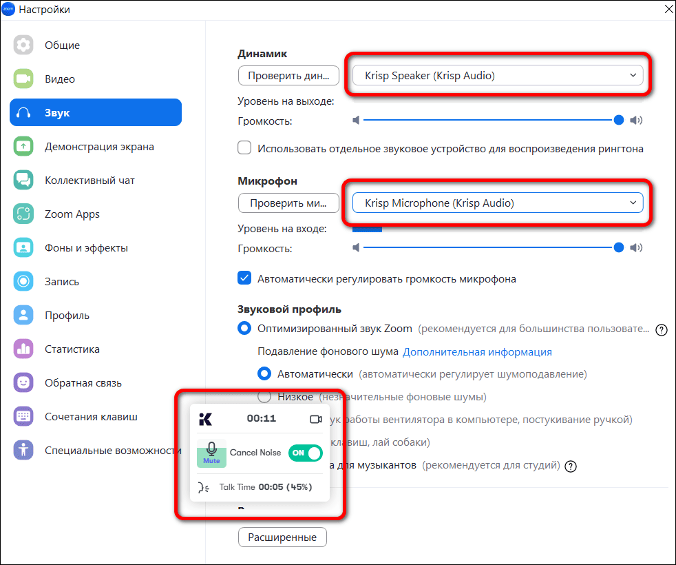 В настройках любой программы, использующей микрофон или динамик (в примере используется Zoom), выберите драйвер Krisp. Появится небольшое диалоговое окно, отражающее процесс передачи звука.