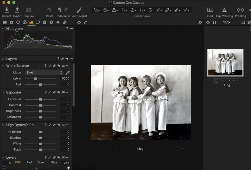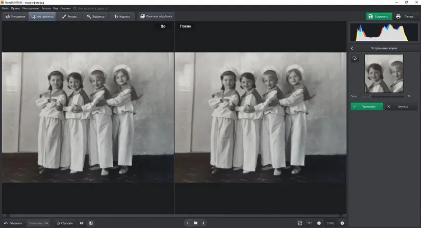 Подходит для быстрого исправления архивных фотоснимков с помощью пресетов. Можно переключиться в ручной режим или воспользоваться пакетной обработкой для быстрого исправления нескольких фотоснимков. Здесь легко изменить яркость и контрастность, экспозицию, удалить пиксели. Но для более тонкой ретуши приложение не подходит: в наборе инструментов нет возможности послойного редактирования.
