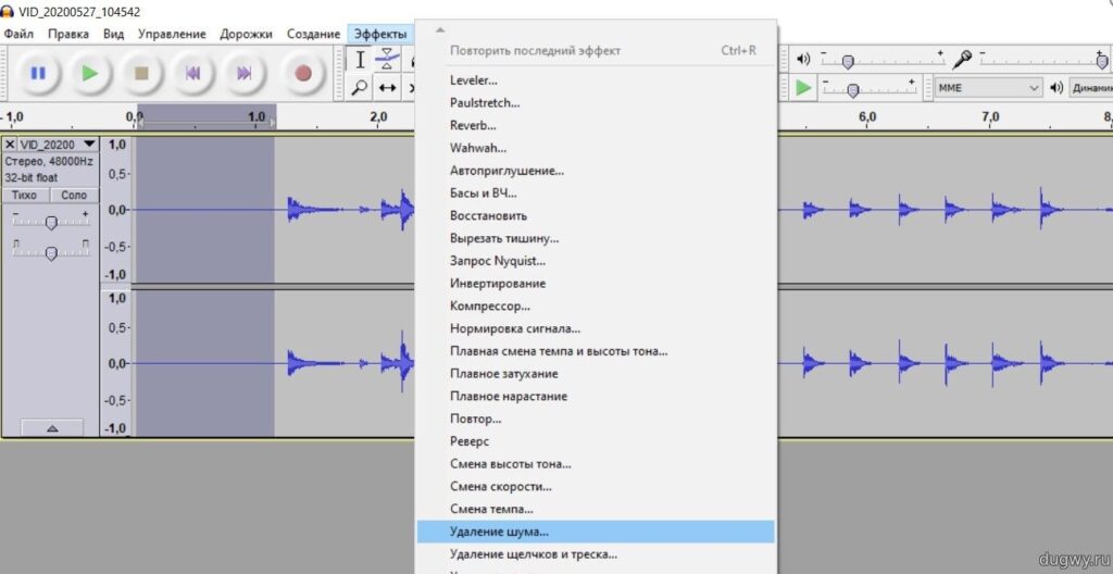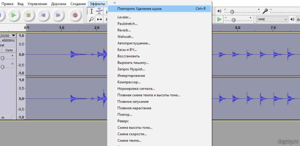Затем нужно будет перейти на вкладку “Эффекты” и выбрать пункт “Удаление шума…“. В новых версиях программы, более новых, пункт будет называться “Noise Reduction…“. Сейчас самая свежая версия — 2.4.1 и найти её можно на официальном сайте программы.
