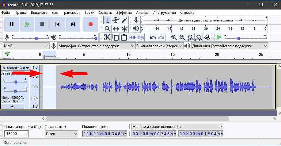 2. Как переместить звук в Audacity