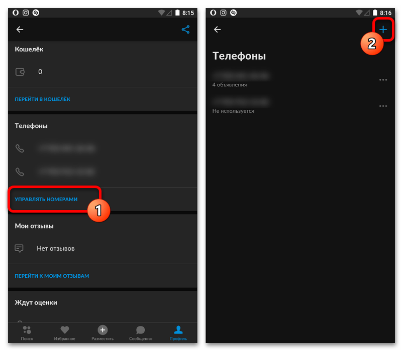 Добравшись до указанной категории, воспользуйтесь ссылкой «Управлять номерами». Так как для отвязки одного из старых номеров нужен новый, после этого коснитесь значка «+» в правом углу экрана.