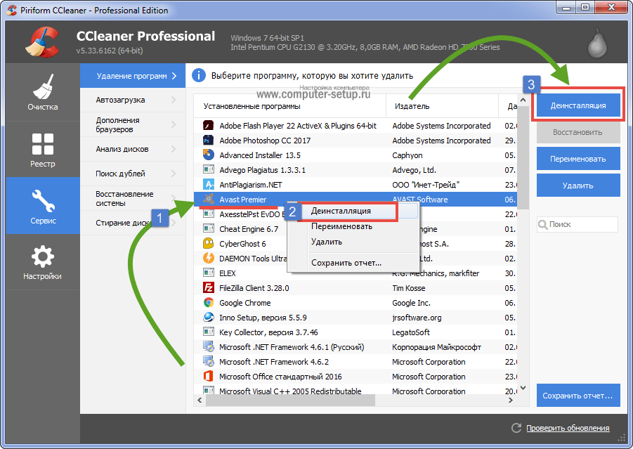 Процедура удаления антивируса Аваст в CCleaner мало чем отличается от процесса его стирания средствами операционной системы Виндовс 7, Виндовс 8 и 10.