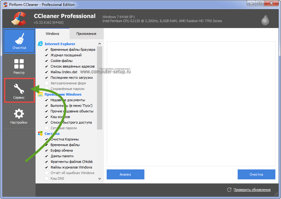 2Запускаем утилиту для удаления мусора и ПО с компьютера и переходим в раздел «Сервис».