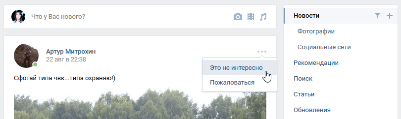 На этот раз нам понадобится запись нашего недруга в новостной ленте. Способ, к сожалению, работает не всегда. Если человек давно не публиковал новых записей на своей стене, этот способ не поможет, а значит воспользуйтесь третьим способом. Но если ваш друг активно публикует новые посты или публиковал недавно, вы можете прокрутить ленту вниз и с лёгкостью найти один из его постов. Но чтобы его пост было проще найти, сделайте следующее: