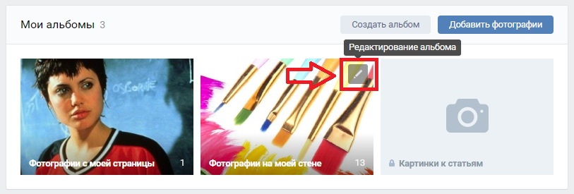 - Наведите курсор мыши на альбом, появится всплывающая подсказка в виде иконки карандаша и надпись Редактирование альбома .