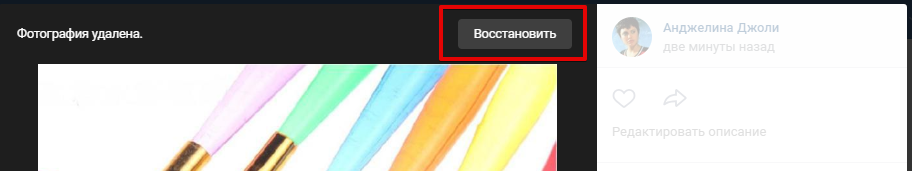 Обратите внимание, после того как вы нажали на кнопку удалить вверху фотографии появилась кнопка Восстановить. Вы можете восстановить удаленное фото пока не закрыли окно, как только закроете, восстановить будет нельзя