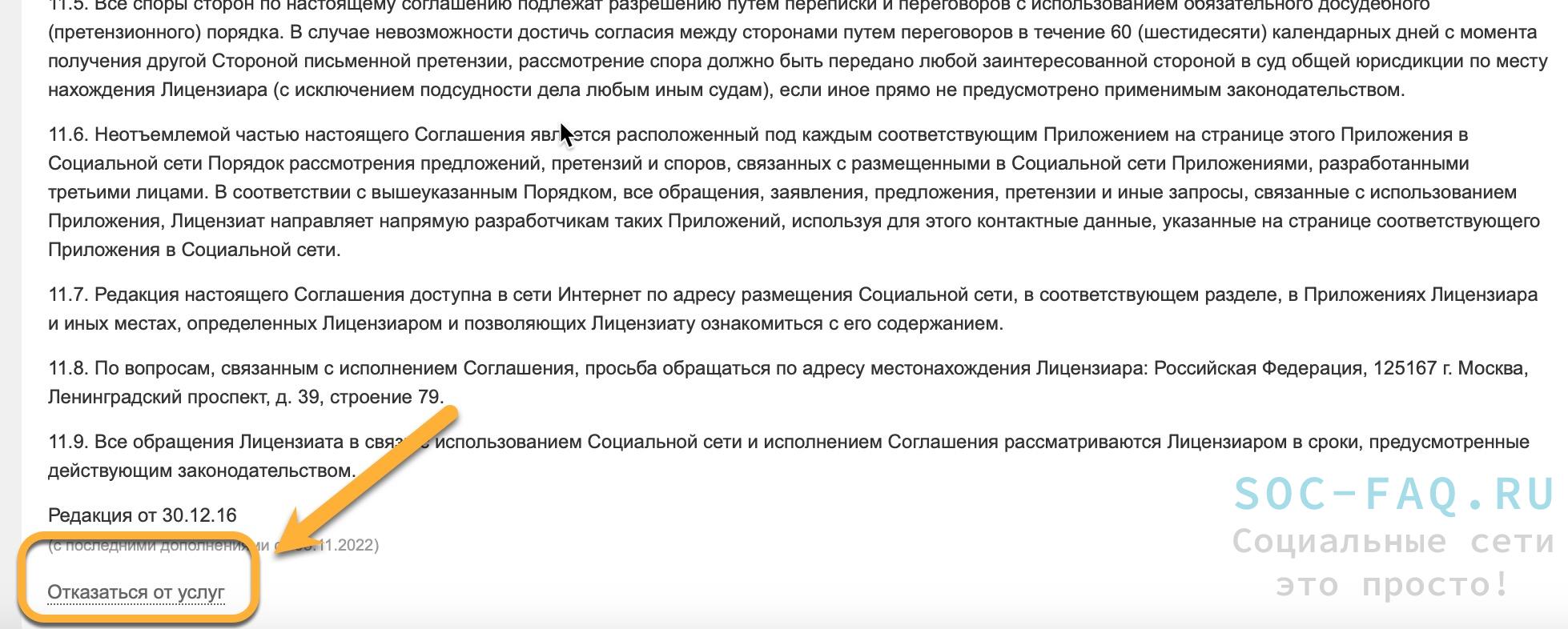 2. Снова воспользовавшись скроллированием (полосой прокрутки), под длинным сводом правил найдите ссылку «Отказаться от услуг» и перейдите по ней (на ПК: наведите курсор и нажмите левую кнопку мышки).