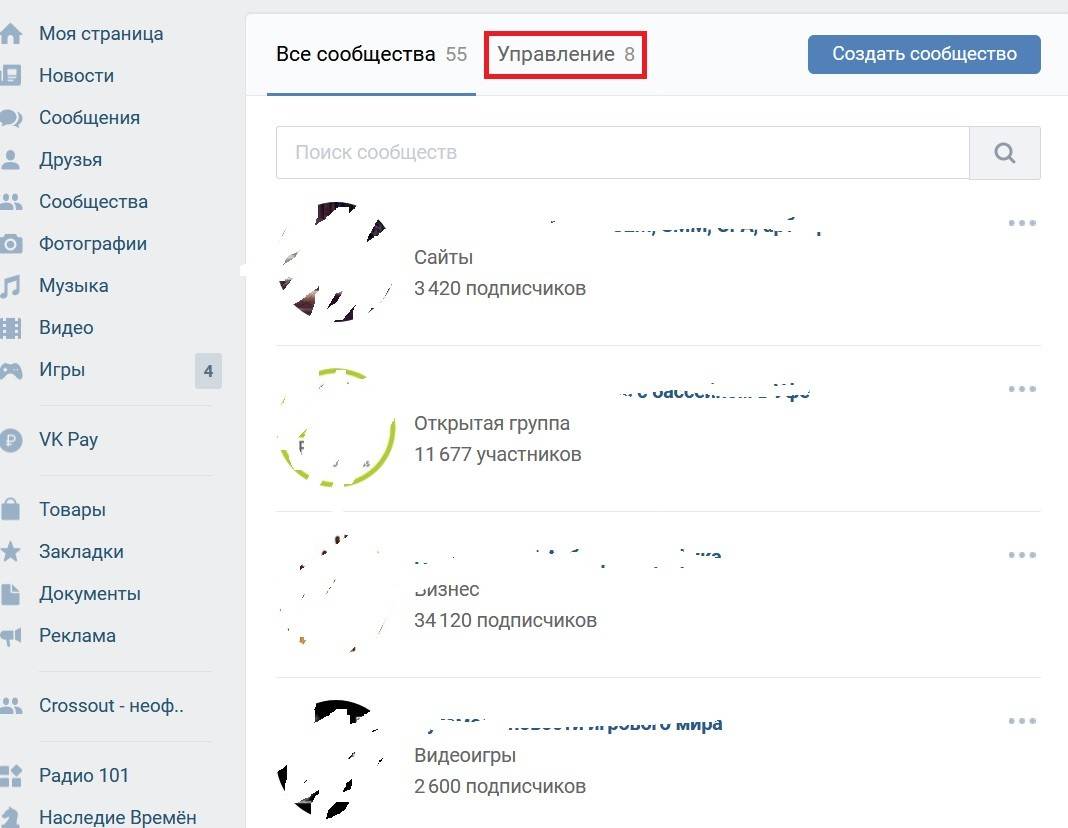 Заходите на сайт vk.com и на свою личную страницу. В левом блоке выбирайте «сообщества». На следующей странице перейдите на верхнюю вкладку «Управление». Перед вами будет список сообществ и пабликов в которых вы являетесь администратором, создателем или модератором. Под названием сообщества вы можете заметить ее тип или тематику. Смотрите скриншот, чтобы разобраться в идентификации.
