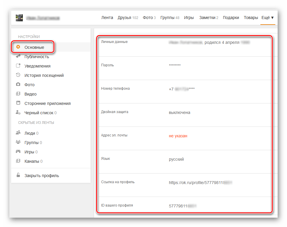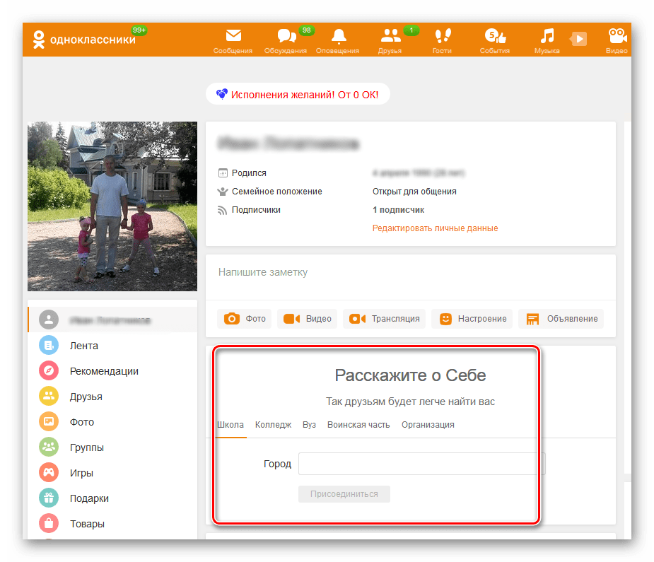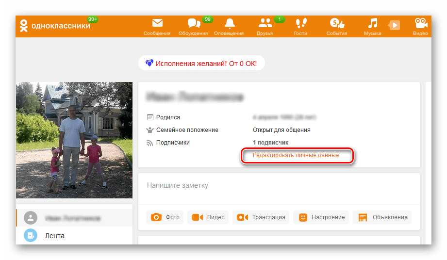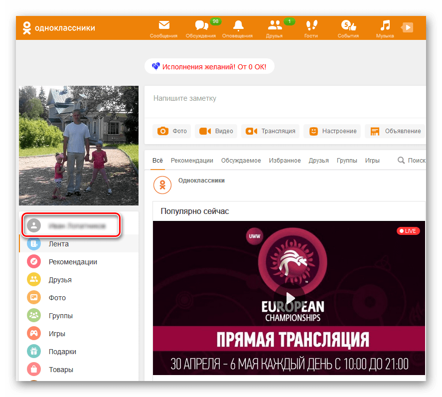 - в левом верхнем углу профиля кликаем на логотип «ОК»;