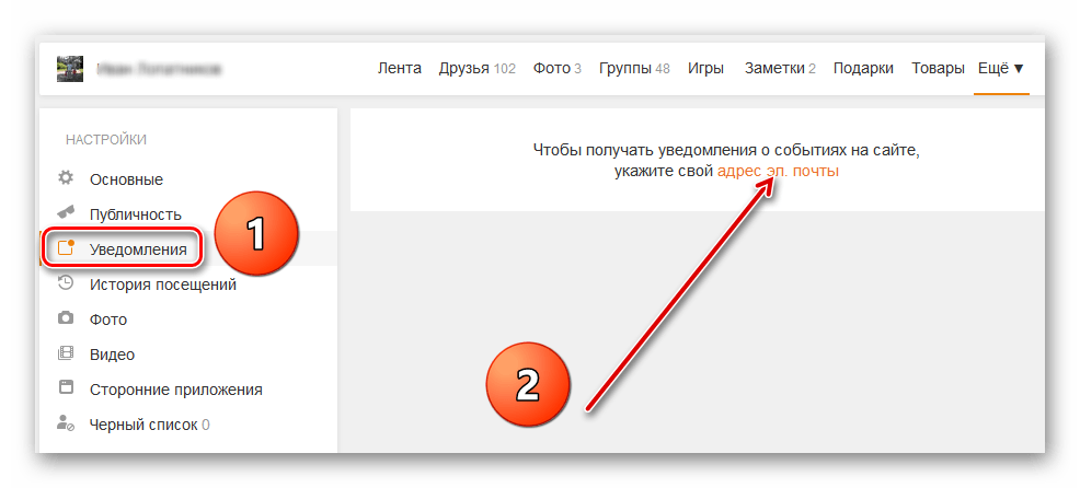Переходим на вкладку «Уведомления». Если вы хотите получать оповещения о событиях на сайте, то нужно указать адрес электронной почты, на которую они будут приходить.