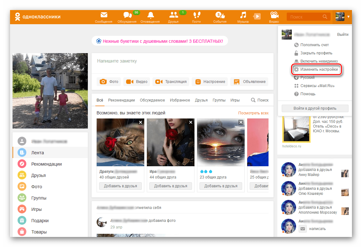 Войдите в свой аккаунт в социальной сети Одноклассники. Под главной фотографией расположено несколько опций, выберите «ещё» и нажмите. Появляется перечень действий, в котором нужно выбрать опцию «изменить настройки». Изменение настроек для пользователей бесплатно.