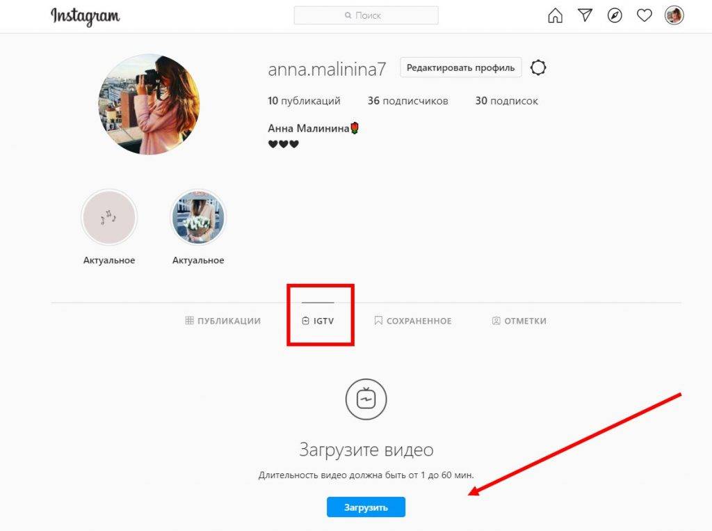 - Выбрать «IGTV» в публикациях – нажать по кнопке: «Загрузить видео».