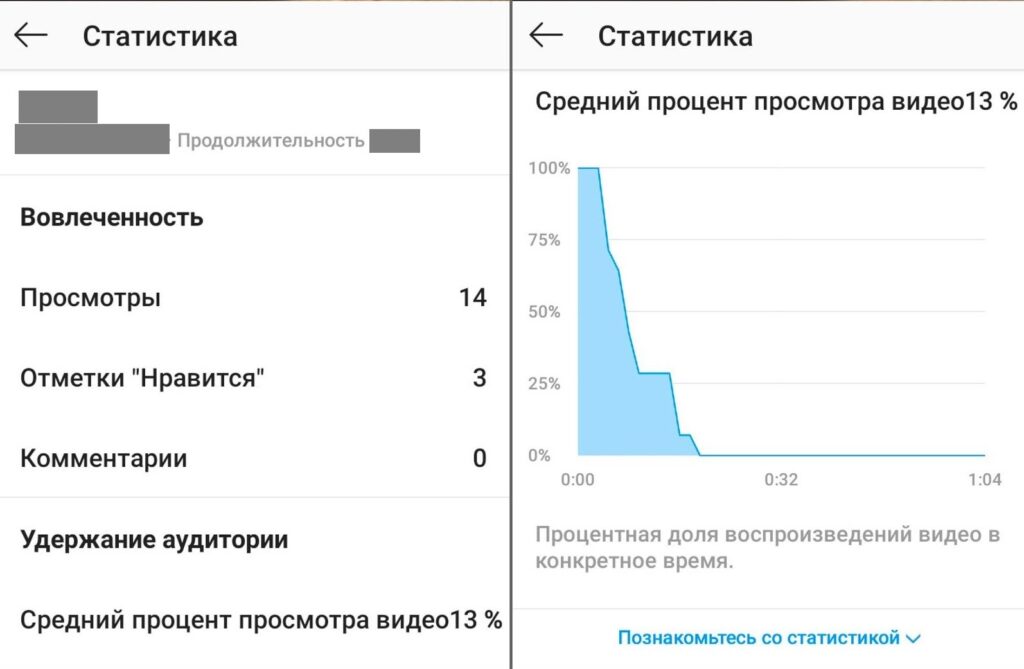 Как и в Сторис, будет показано количество просмотров, сколько взаимодействий было совершено. Отличается только диаграммой заинтересованности зрителей: сколько досмотрели и когда публика заходила посмотреть чаще всего.