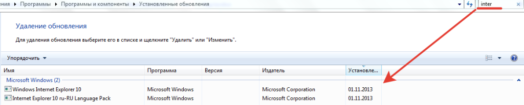 Перед нами огромный список всех обновлений, которые когда-либо устанавливались на ваш компьютер. Чтобы быстро найти наш обозреватель, вводим в строку поиска «inter». В итоге должно остаться лишь то, что касается Эксплорера.