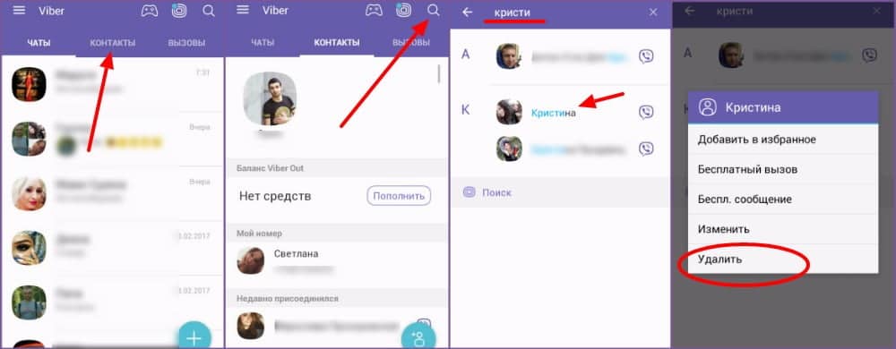 - Выбрать из списка контактов собеседника, с которым пользователь больше не хочет общаться в Вайбере.