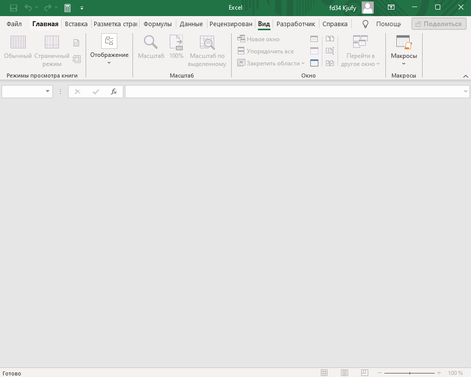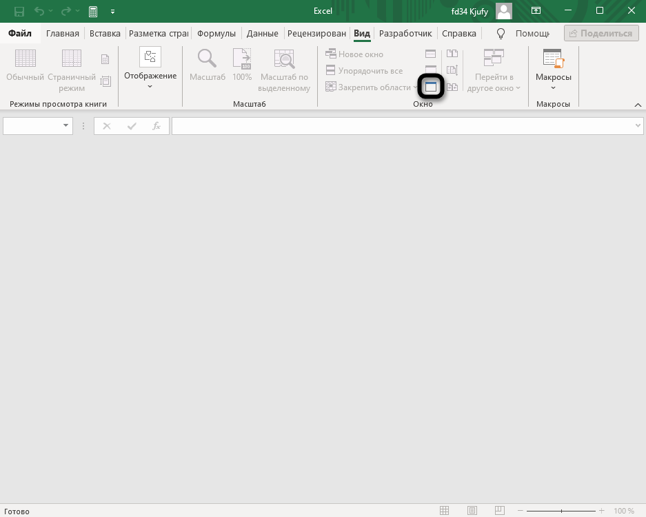 Далее вы видите, как выглядит окно программы со скрытой книгой. Отсутствуют все вкладки листов и ячейки, не подсвечиваются функции и другие составляющие.