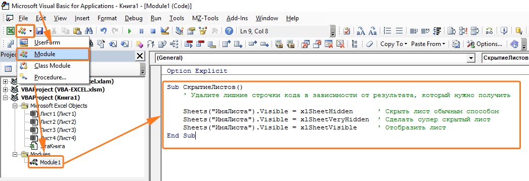 - Создайте новый модуль (если его у вас еще нет), в котором мы будем писать код для скрытия листов.
