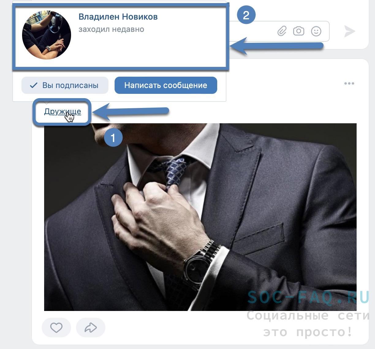 Для добавления сообщений на стену или написания комментариев, можно воспользоваться более простым способом. Например, на своего друга вы можете сослаться, поставив в сообщении значок “@”. Он вызывает выпадающее меню со списком ваших подписчиков. Остаётся только выбрать нужного.