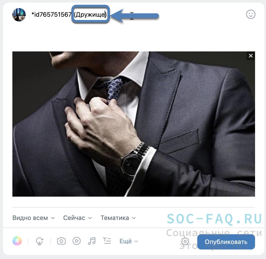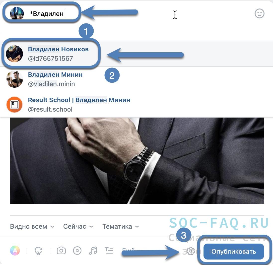 1. При создании нового поста или редактировании уже опубликованного напишите в тексте символ собаки — @