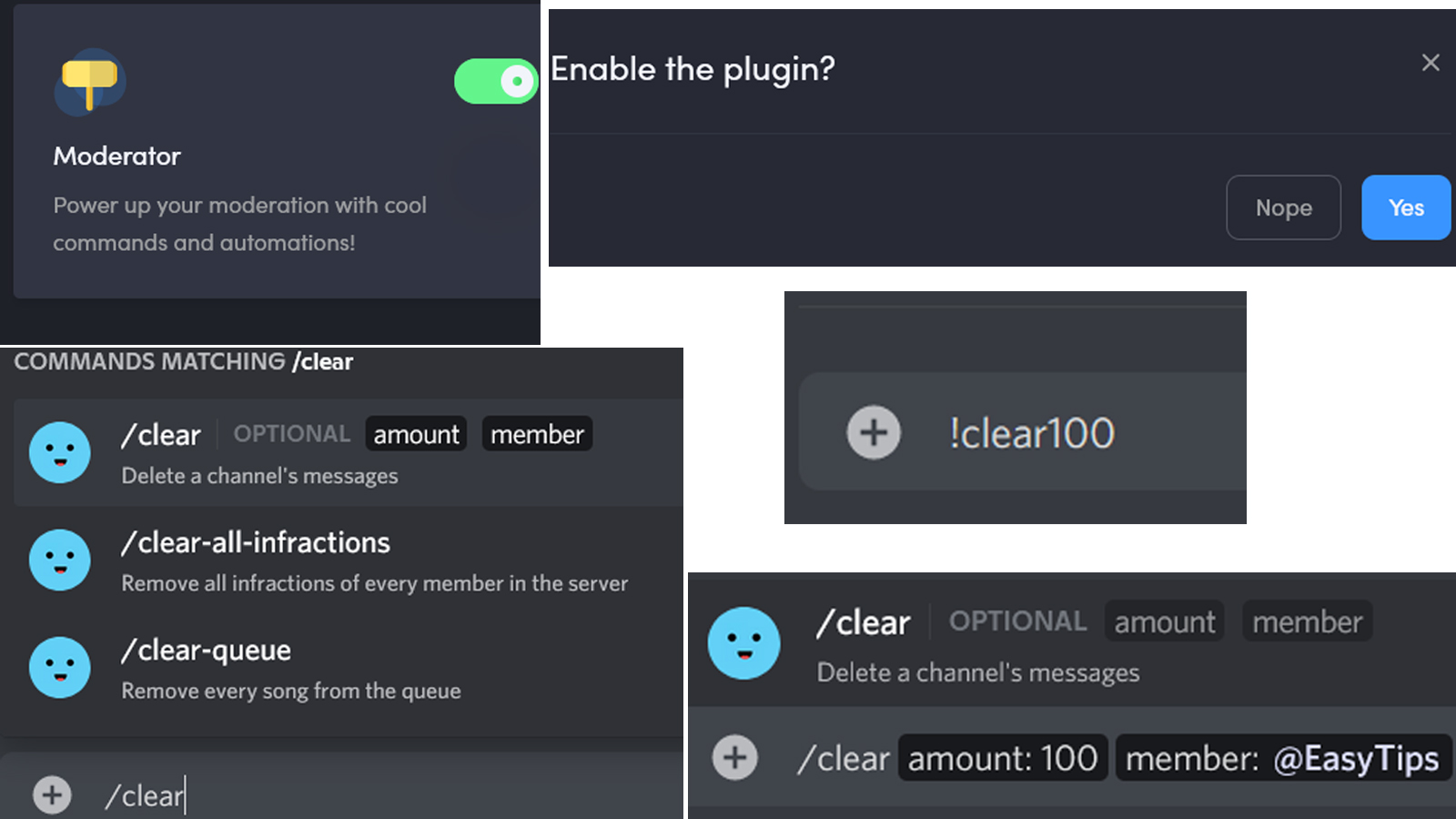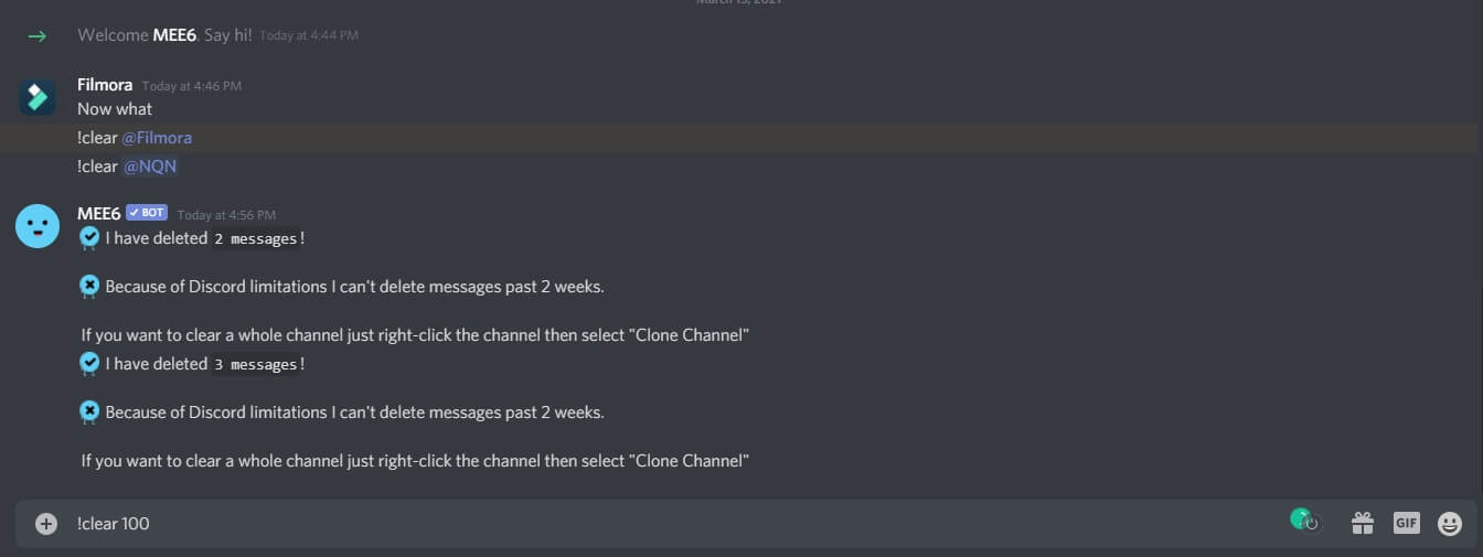 - Type ‘!clear 100’ to delete the 100 latest messages in the channel. Modify the number as required, with a maximum of 1000 at a time. Remember to use a space between the command and the number.