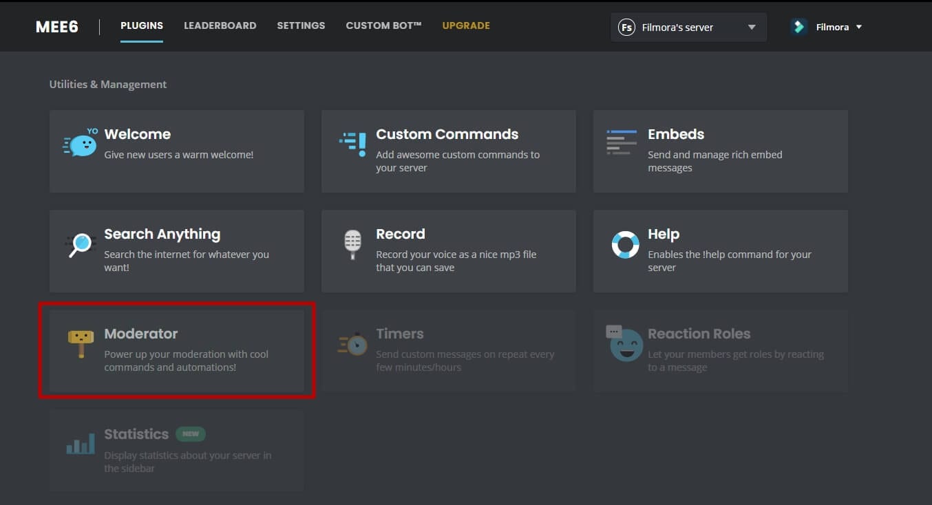 - Now, go to the MEE6 Dashboard for your server. Toggle on the ‘Moderator’ option and enable the plugin by selecting ‘Yes’.