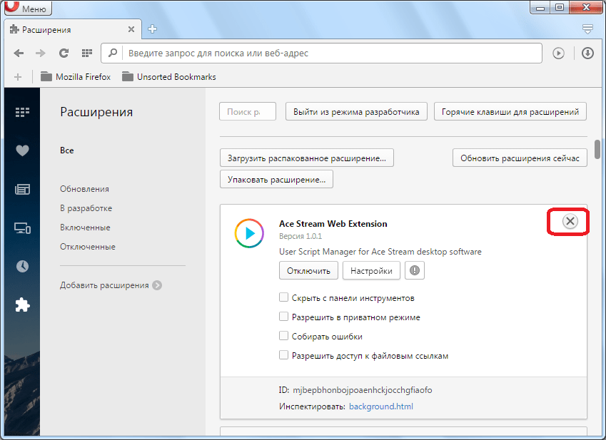 Процедура удаления дополнения не столь очевидна, как, например, отключения, но все равно очень проста. При наведении на блок настроек с конкретным расширением, в верхнем правом углу данного блока появляется крестик. Кликаем по этому крестику.