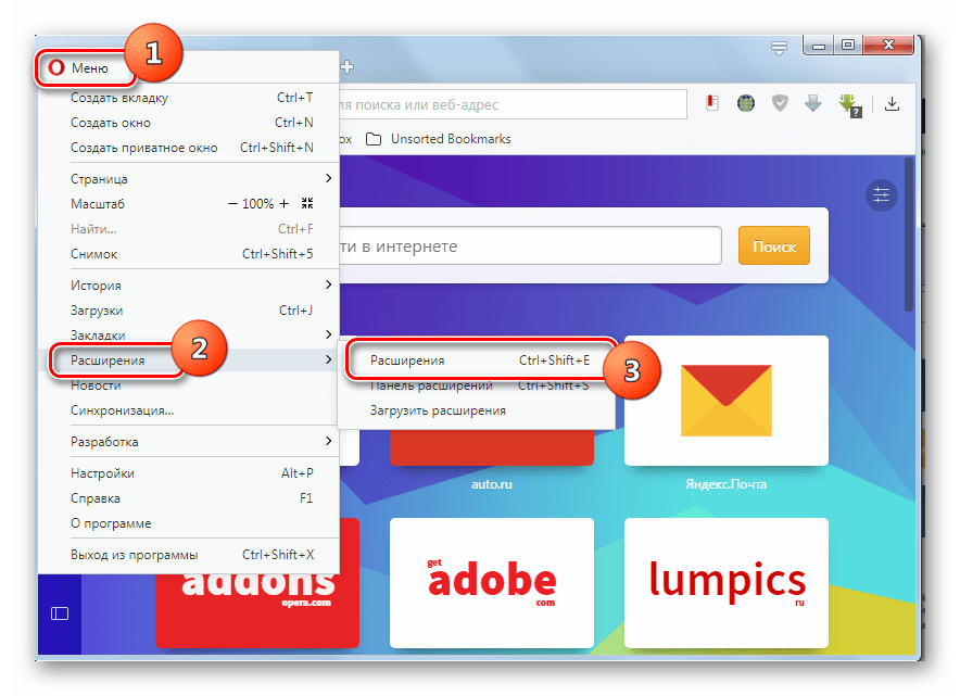 Для того, чтобы начать процедуру удаления дополнения, нужно сразу перейти в раздел расширений. Для этого, заходим в главное меню Оперы, кликаем на пункт «Расширения», и далее переходим в раздел «Расширения». Либо же можно просто набрать комбинацию клавиш на клавиатуре Ctrl+Shift+E.