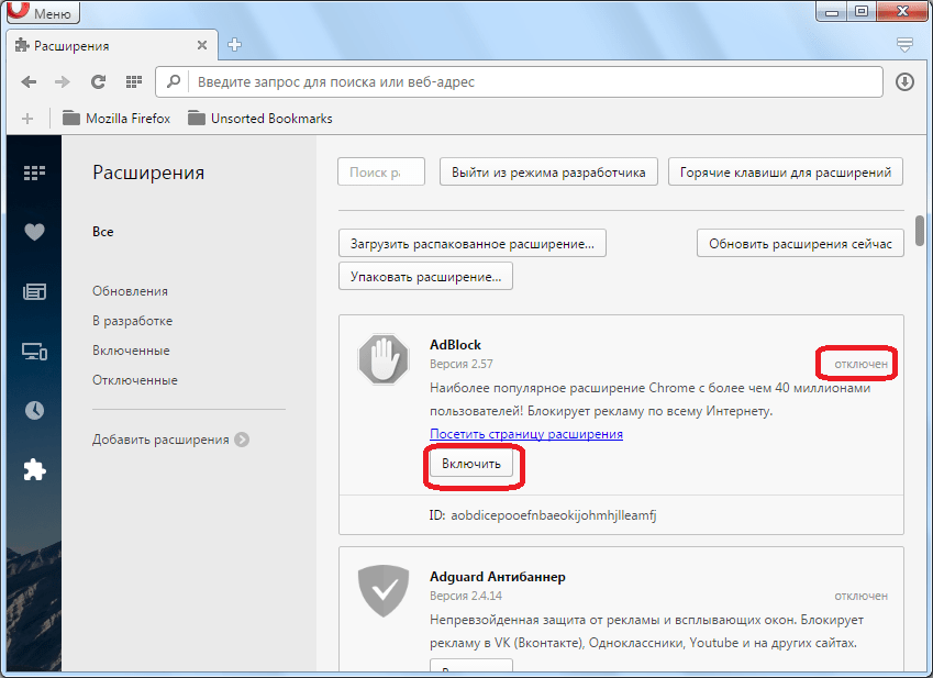 Если вы хотите включить не плагин, а дополнение, перейдите всё в том же окне в раздел «Расширения» и нажмите кнопку «Включить» рядом с нужным дополнением. После этого потребуется перезапустить браузер.