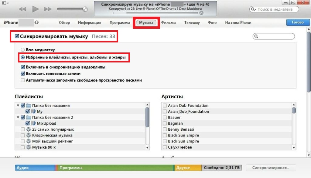 Затем при синхронизации с i-устройством, если вы не хотите перенести медиатеку iTunes всю, а желаете скинуть конкретные подборки, нужно будет выбрать пункт «Избранные плейлисты, артисты, альбомы и жанры» и указать желаемые.