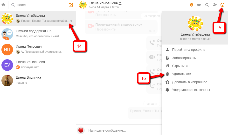 Удалить всю переписку с пользователем можно только у себя в диалогах, при этом у вашего контакта вся переписка сохранится. Для удаления чата полностью в разделе диалогов выделите мышью нужного пользователя (14), чтобы справа отобразилась вся ваша переписка. В верхнем правом углу диалога нажмите на иконку с буквой i (15), после чего в выпадающем меню нажмите на пункт «Удалить чат» (16):