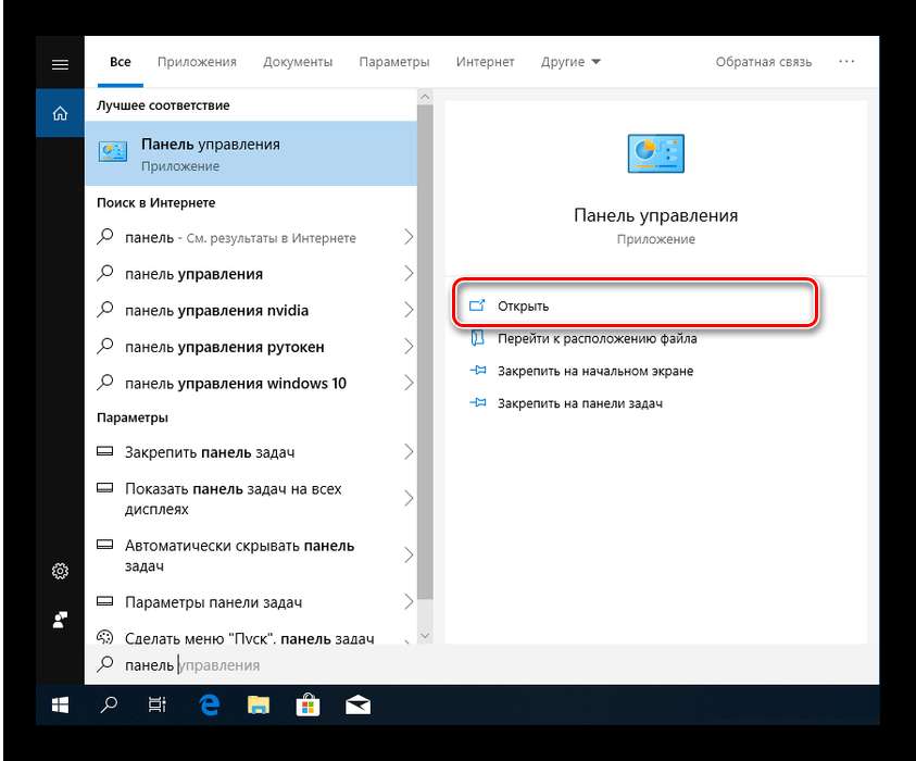 - Для открытия «Панели управления» используйте или «Пуск» (Виндовс 7 и предыдущие ей версии), или инструмент «Поиск», в каком введите заглавие компонента и нажмите на кнопку «Открыть» в правой части окна.